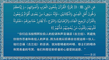عَنِ النَّبِىِّ ﷺ: ( اِقْــرَؤُا الْقُرْآنَ بِلُحُونِ الْعَرَبِ وَأَصْوَاتِهِمْ ، وَ إِيَّاكُمْ وَلُحُونَ أَهْلِ الْفِسْقِ وَالْكِتَابَــيْنِ ، فَإِنَّهُ سَيَجِىءُ مِنْ بَــعْدِى أَقْــوَامٌ يُــرَجِّعُونَ بِالْقُرْآنِ تَــرْجِيعَ الْغِنَاءِ وَالرَّهْبَانِيَّةِ وَالنَّوْحِ ، لَايُجَاوِزُ حَنَاجِرَهُمْ ، مَفْتُونَةً قُــلُوبُهُمْ وَقُــلُوبُ مَنْ يُــعْجِبُهُمْ شَأْنُــهُمْ ) |