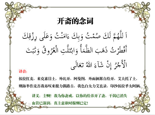 真主啊!我为了你封了斋,以你的给养开了斋,